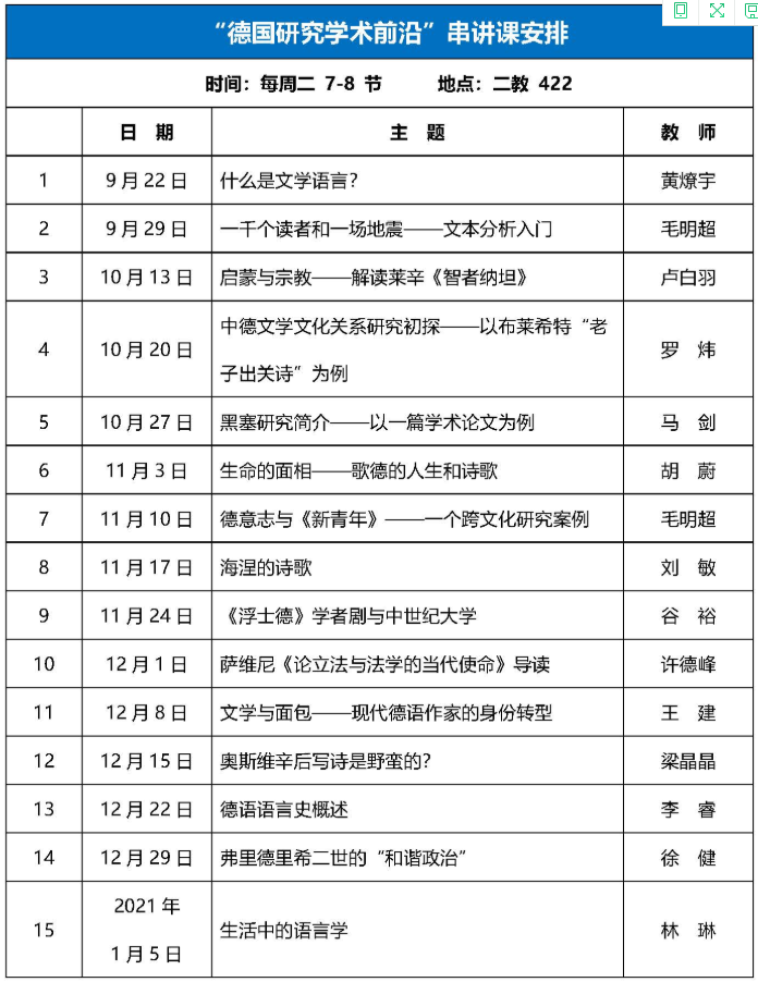 德语系2020年秋季“德国研究学术前沿”系列讲座预告