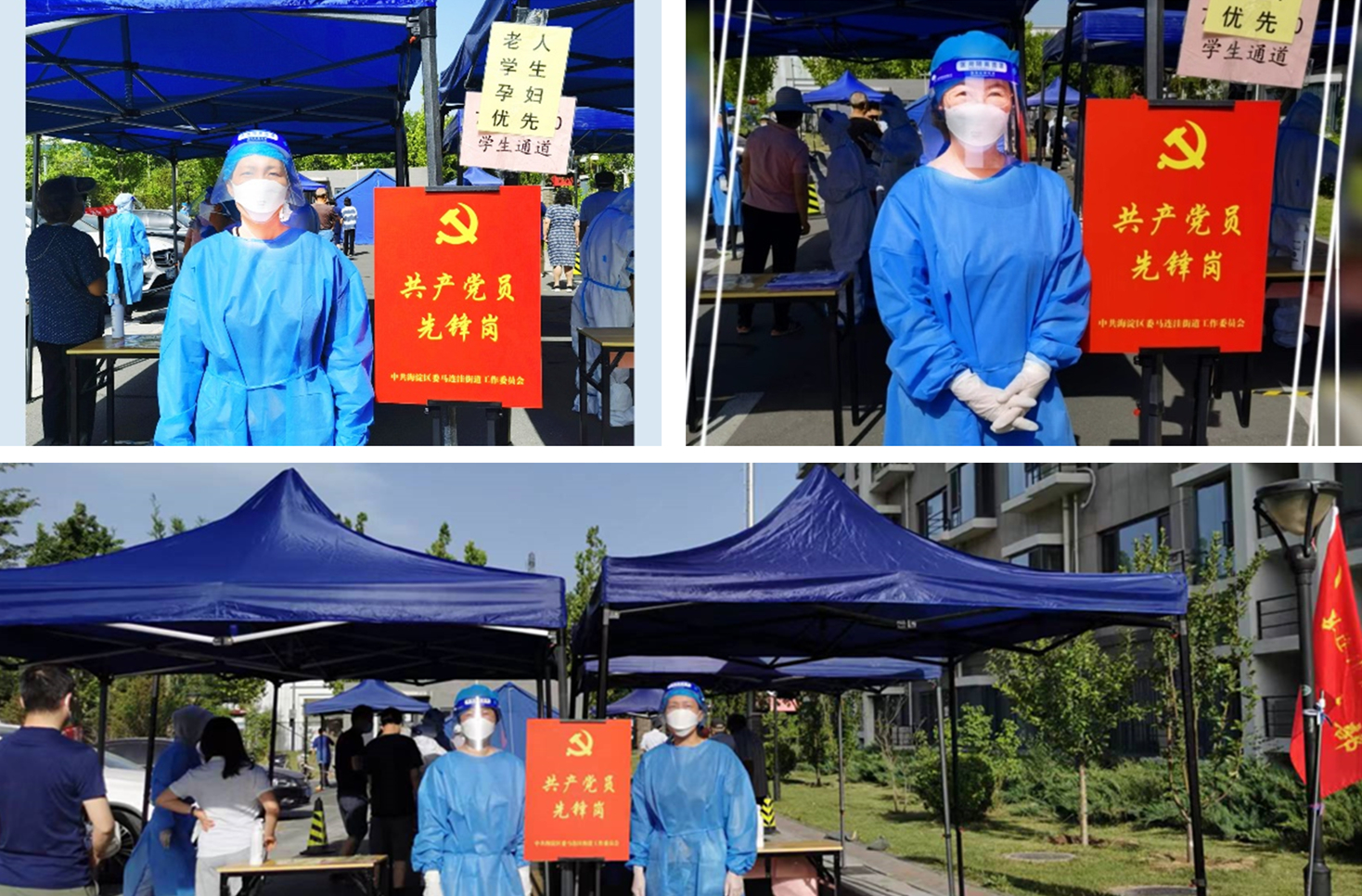 业务办陈静老师和学院办公室张一宁老师居住在肖家河三区,她们积极参与到社区防疫工作中,成为光荣的“小蓝”志愿者,负责核酸检测过程中,查验北京市健康宝、维持核酸检测队伍秩序等工作。