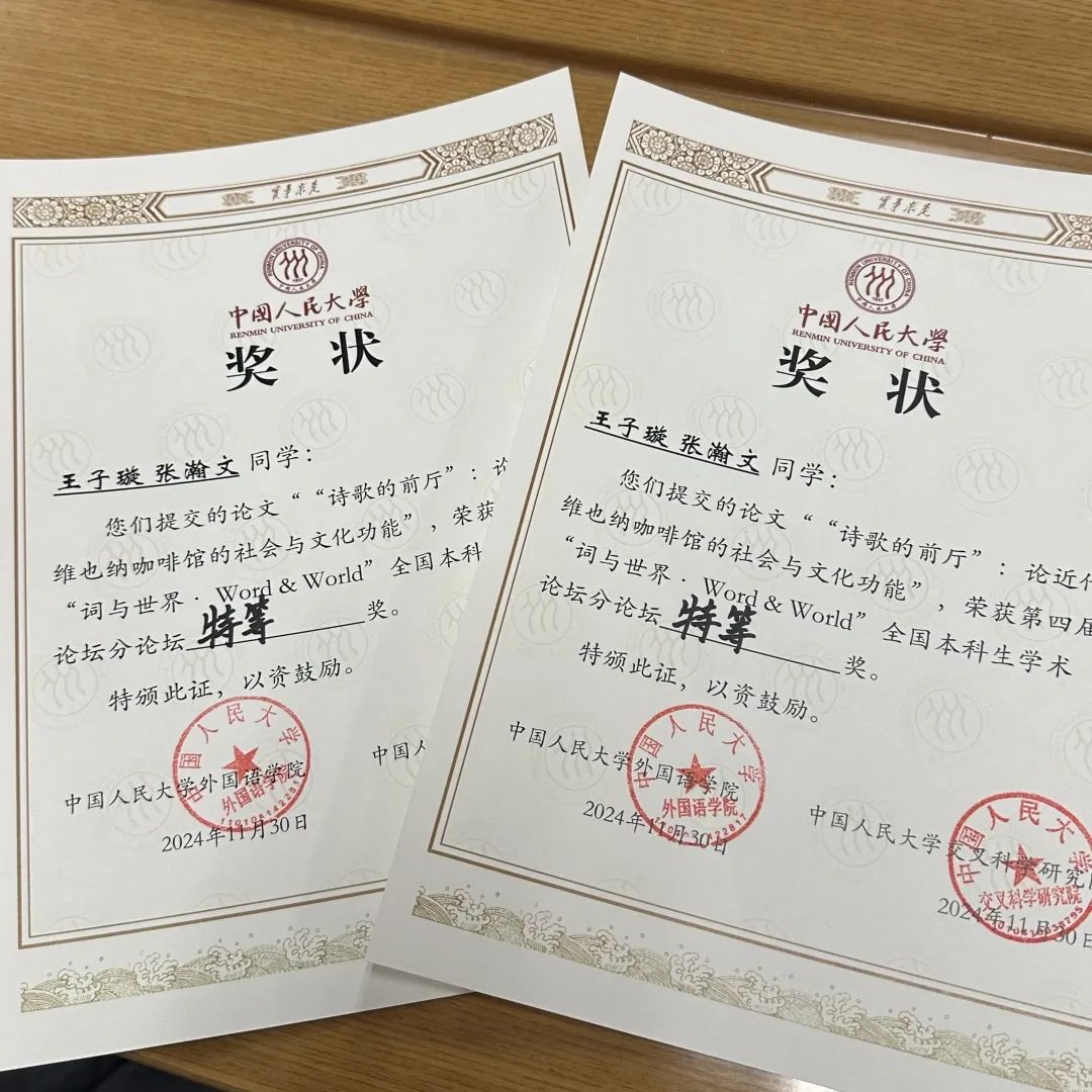 2024年11月30日,由中国人民大学乐鱼官方网站,乐鱼leyu(中国)、交叉科学研究院主办的第四届“词与世界”全国本科生学术论坛顺利落幕。本届论坛以“外国语言文学与跨学科创新”为主题,涵盖英语、法语、德语、日语、俄语、西班牙语六个语种,面向全国高校本科生征稿。乐鱼官方网站,乐鱼leyu(中国)德语系2023级本科生王子璇、张瀚文在德语系林琳老师的指导下,完成了以《‘诗歌的前厅’:论近代维也纳咖啡馆的社会与文化功能》为题的研究,在论坛宣读报告,最终荣获分论坛特等奖的殊荣。