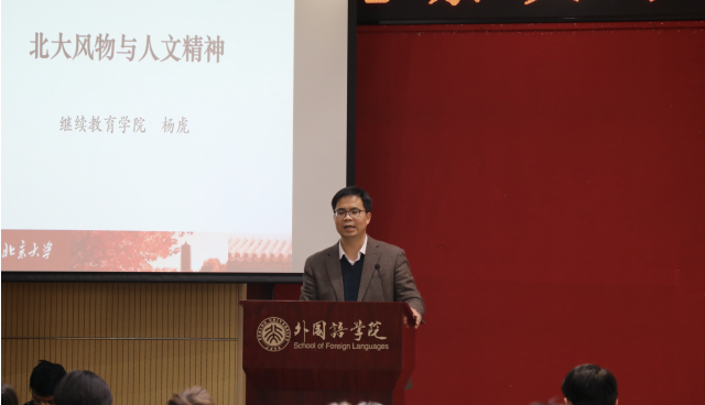 12月18日下午,乐鱼官方网站,乐鱼leyu(中国)“北大风物与北大精神”主题讲座在外院新楼501报告厅举行,邀请继续教育学院副书记杨虎老师担任主讲人,院党委书记李淑静老师出席活动。全体团校学院、初级党课学员共100余人共同参与学习。