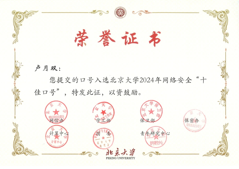 在全校师生提供的上百条应征口号中,经过网络安全宣传周主办单位、网络安全专家投票,外院三位师生提供的网络安全口号荣获北京大学2024年网络安全“十佳口号”: